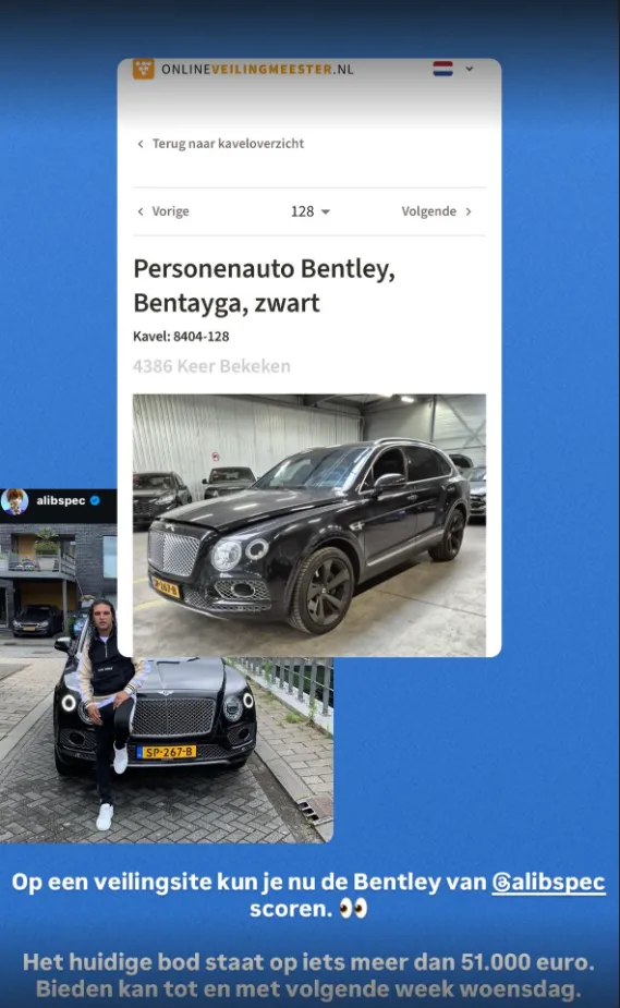 Ali B staat op een veilingsite die beheerd wordt door de overheid. Ja, diezelfde auto waarin hij jarenlang rondreed en die regelmatig in zijn videoclips verscheen. Het gaat niet om een standaard occasion, maar om een luxe auto in topstaat. Wie geïnteresseerd is, kan nu bieden. Het is een unieke kans om een auto van een van Nederlands bekendste rappers in bezit te krijgen. Wie weet rijdt binnenkort iemand anders rond in Ali B’s oude bolide. De auto heeft alle luxe van een Bentley en is klaar voor een nieuwe eigenaar. Ali zelf mag er, nu hij gedwongen op kleinere voet moet gaan leven, geen gebruik meer van maken.