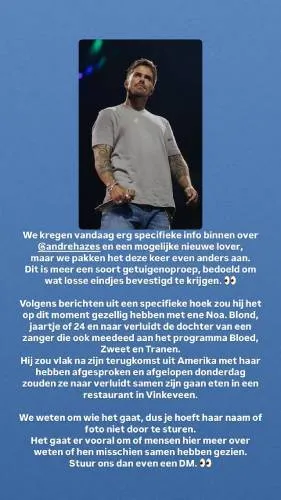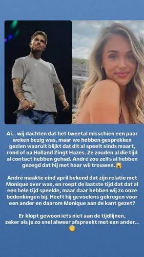 De relatie tussen André en Monique, met wie hij een zoontje deelt, is altijd al turbulent geweest. Het stel heeft jarenlang een knipperlichtrelatie gehad waarin vooral André’s onvermogen om monogaam te blijven, centraal stond. Eind april maakte hij bekend dat het écht over was. Maar terwijl iedereen dacht dat hij nog aan het rouwen was om het gezinsleven dat hij achterliet, blijkt de zanger achter de schermen alweer druk in de weer te zijn met een nieuwe liefde.