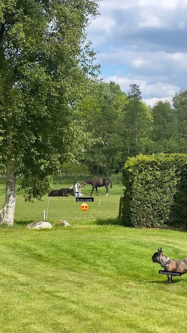 Op haar Instagram Story deelt Antoinette een foto waarop haar man Coen liefdevol bezig is met haar paarden. Hij staat erbij buigt zich over een van de dieren en straalt rust uit. Antoinette zelf blijft op afstand verscholen achter het groen en legt het tafereel stiekem vast. Het bijschrift-figuurtje dat ze gebruikt is kort maar krachtig en verraadt precies wat ze voelt.