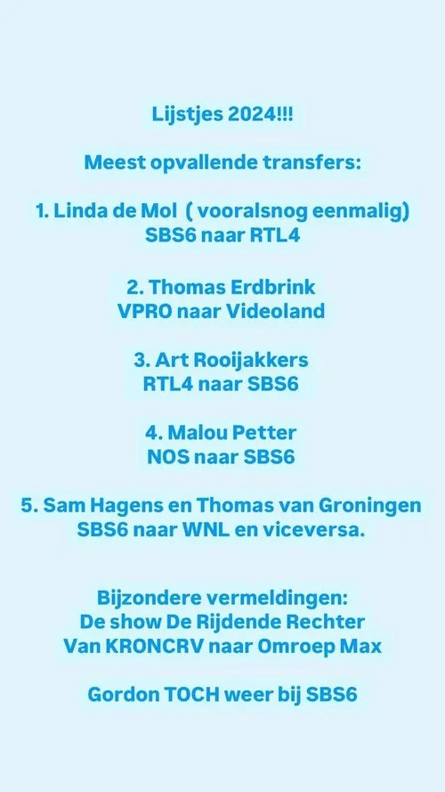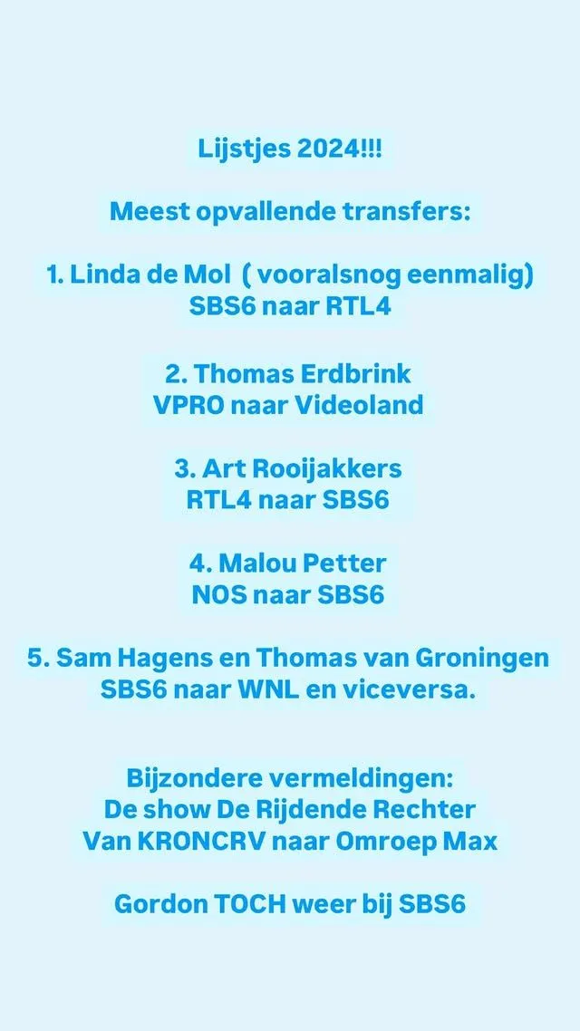 De meeste van deze tv-transfers hebben één ding gemeen: niemand zag ze aankomen. Wie behoren tot de vijf (of stiekem zes) meest schokkende moves volgens tv-expert Tina Nijkamp? We beginnen met Linda de Mol. Linda is weer terug bij RTL4, al lijkt dit wel voor nu maar een eenmalige overstap te zijn. Haar keuze voor de zender heeft veel verschillende reacties gekregen. Sommigen zien het als een mogelijke comeback voor Linda, terwijl anderen vermoeden dat het slechts om maar iets kleins gaat. Een andere opvallende transfer die Tina Nijkamp in het lijstje heeft gezet is die van journalist Thomas Erdbrink. Na jarenlang werkzaam te zijn geweest bij de VPRO kiest hij nu voor een compleet andere richting! Thomas gaat namelijk naar Videoland. Hier gaat hij werken aan allerlei documentaires. Dit is zeker een grote stap voor een journalist. Dus hij zal vast erg trots zijn op deze stap in zijn leven. En ook fans van Thomas zijn natuurlijk erg blij voor hem.