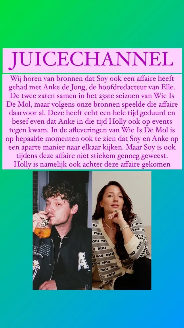 Soy Kroon heeft al heel erg lang een relatie met Holly Mae Brood. Maar hij bevindt zichzelf echter regelmatig in het bed van een andere dame! Ook is er nu weer nieuwe informatie vrij gekomen waardoor we weten dat hij ook is vreemd gegaan op Holly met een Wie Is De Mol -deelneemster die wel wat ouder is dan hem. Soy is namelijk 29 jaar oud en de Wie Is De Mol -deelneemster waarmee hij in bed is gestapt is nu 37 jaar oud. De dame waar we het over hebben is Anke de Jong, hoofdredacteur van ELLE . Mensen vinden Holly echt een knappe meid, maar Anke, de beeldschone dame, is blijkbaar echt niet te weerstaan als je zo'n jonge knul bent!