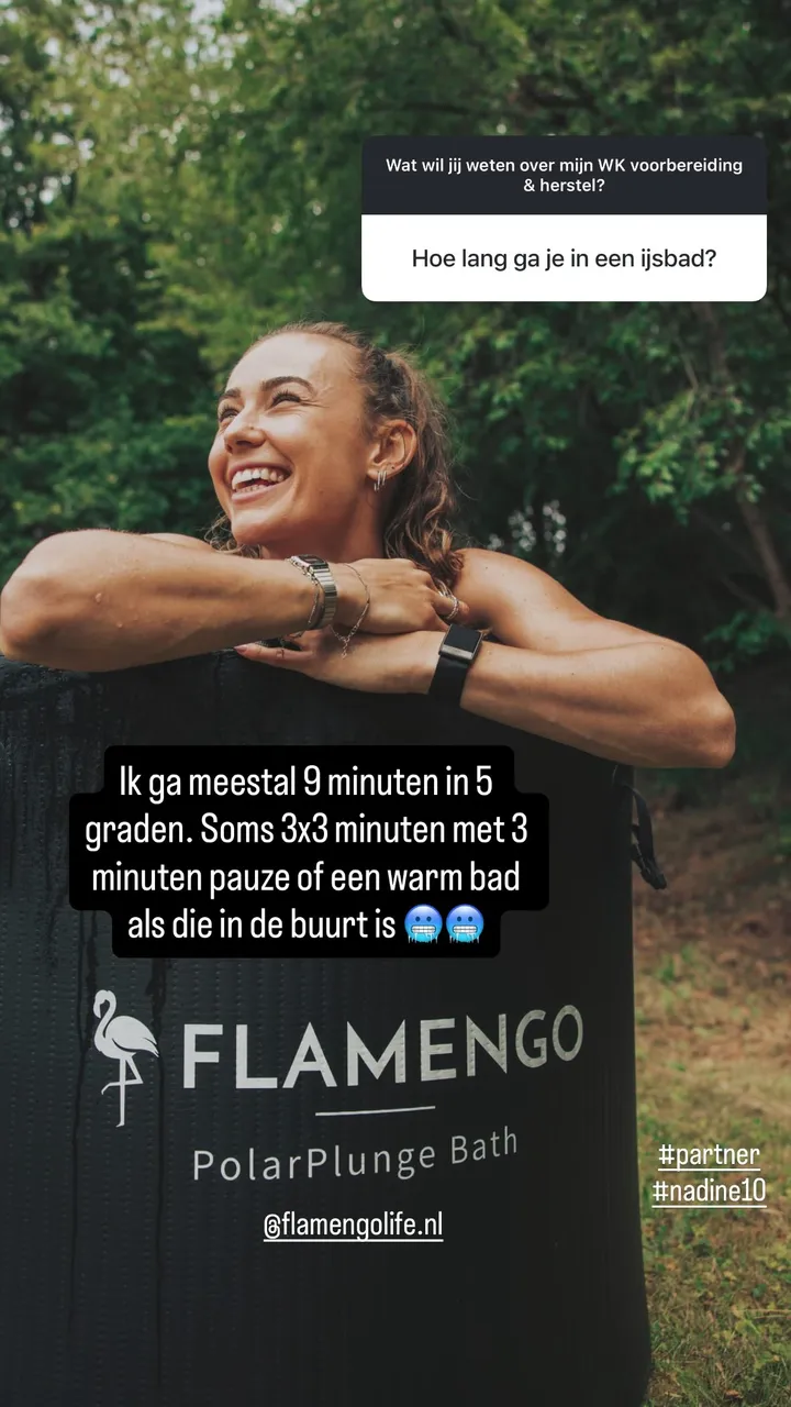 Een van de bekendste herstelmethodes onder topsporters is het ijsbad. En jawel: ook Nadine is fan. Ze gaat meestal zo’n negen minuten lang in water van vijf graden zitten. Voor de gemiddelde man is dat de definitie van zelfkwelling, maar Nadine doet het met een glimlach. Soms splitst ze het op in drie rondes van drie minuten, met een korte pauze of een warm bad tussendoor. Koud, nog kouder, ijskoud… en tóch zweren atleten erbij dat dit wonderen doet voor hun spieren.