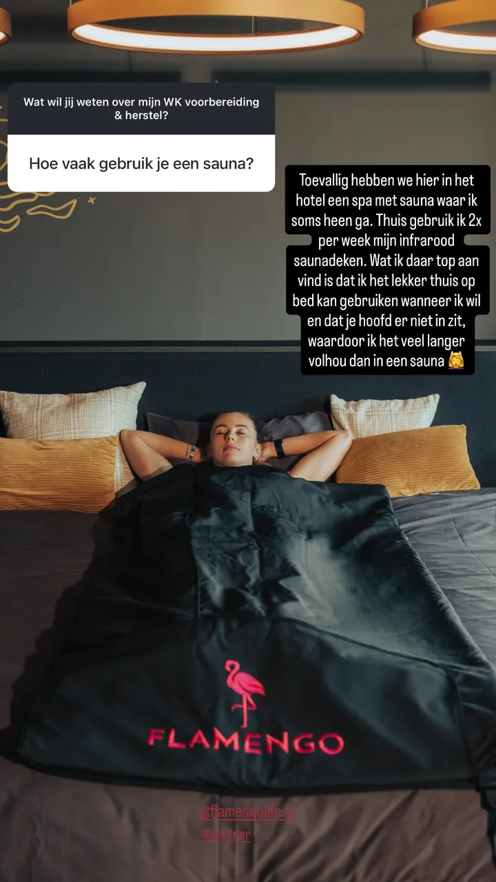 Maar daar blijft het niet bij. Nadine heeft nog een ander geheim wapen: de infrarood saunadeken. Ja, je leest het goed: een deken waarin je letterlijk ligt te zweten, gewoon in je eigen slaapkamer. Het lijkt een beetje op een slaapzak, maar dan eentje die je verandert in een menselijke oven. Het grote voordeel volgens Nadine? Je hoofd blijft buiten de deken, waardoor je het veel langer volhoudt dan in een traditionele sauna. Ze gebruikt ‘m thuis zo’n twee keer per week, meestal lekker vanuit bed. Of dat nu puur topsport is of stiekem ook een handige sponsordeal, dat laten we even in het midden.