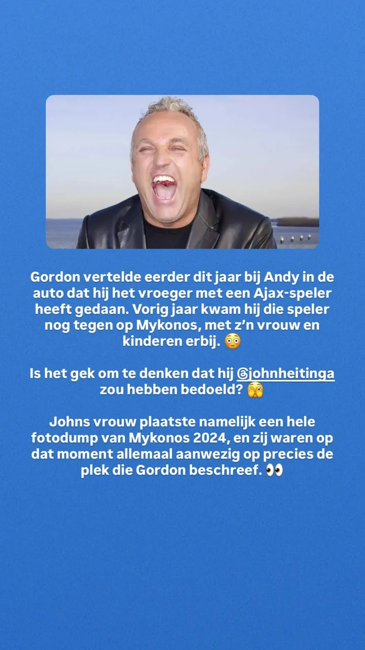 Het kanaal suggereert dat de persoon die de nacht met Gordon beleefde niemand minder dan Ajax-coach John Heitinga zou kunnen zijn! Dit is een vrij gewaagde uitspraak van het juicekanaal. Deze roddel mag je dus absoluut met een gigantische korrel zout nemen.