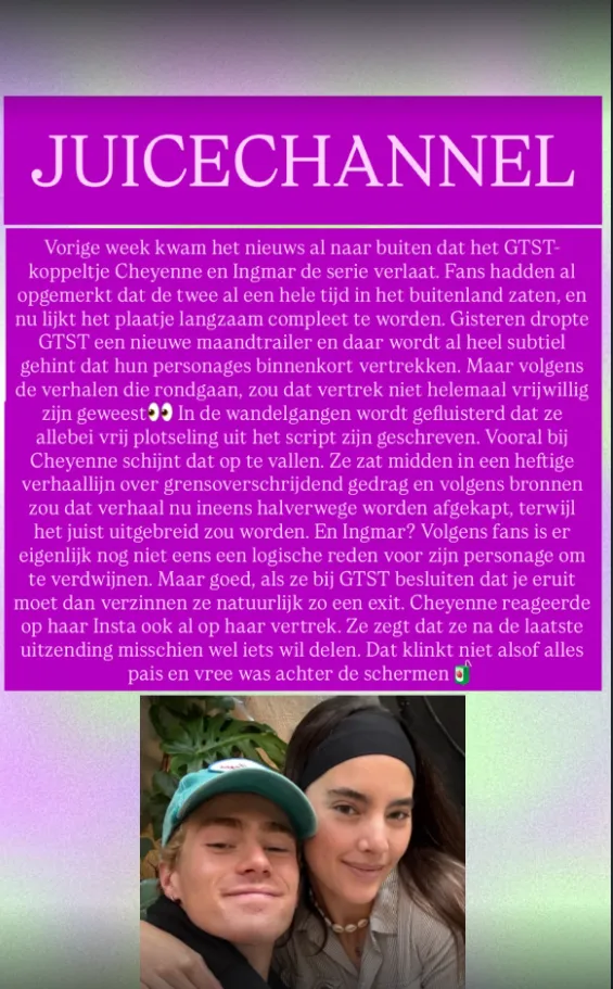 GTST. Cheyenne Löhnen en haar vriendje Ingmar van den Broek lijken ineens uit de populaire soap gestapt te zijn. Maar is dit vertrek echt hun eigen keuze, of heeft de productie ze “uitgeschakeld”? Niemand die het precies weet, maar dat het nieuws voor flink wat opschudding zorgt, staat vast. Fans zijn in elk geval verrast: het