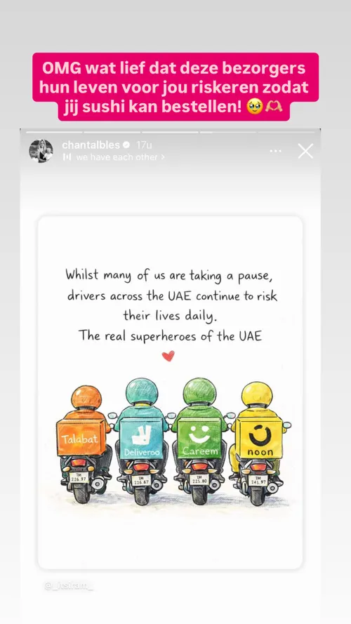 In de story deelt Bles een afbeelding van een illustratie waarop vier bezorgers op scooters te zien zijn van verschillende bezorgdiensten. Boven de afbeelding staat een tekst waarin wordt gezegd dat bezorgers in de Verenigde Arabische Emiraten hun leven riskeren terwijl veel andere mensen juist binnen blijven.
