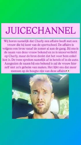 In twee afzonderlijke Story’s op Instagram deelt JuiceChannel details over de vermeende affaire. Volgens de insiders zou Charly het zo geheim mogelijk proberen te houden, maar zijn gedrag zou opvallen bij mensen in zijn omgeving. De twee zouden op ongebruikelijke tijden hotels boeken en elkaar vaak ontmoeten op afgelegen plekken, zoals hotels of in de auto. “Ze doen er alles aan om niet gezien te worden,” aldus een bron.