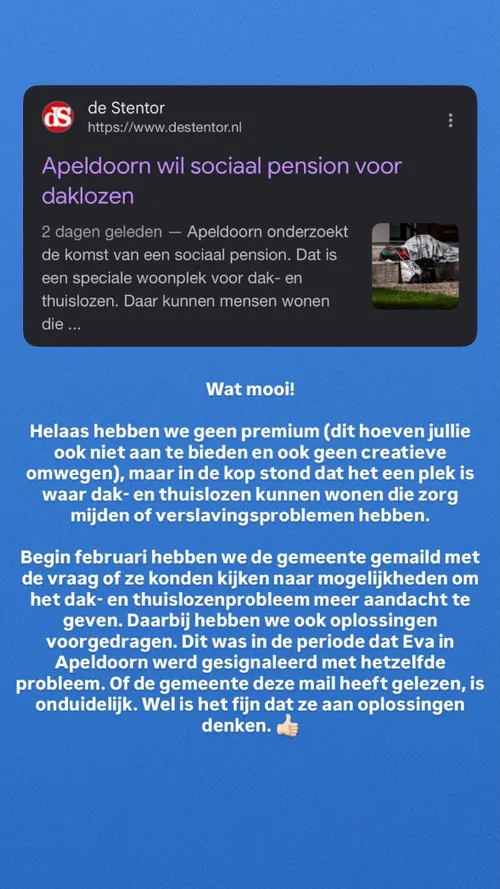 De timing van deze plannen is opvallend. Begin februari werd de gemeente Apeldoorn al benaderd met vragen en ideeën om meer aandacht te geven aan het daklozenprobleem. Dat gebeurde in dezelfde periode waarin Eva’s situatie bekend werd en veel aandacht kreeg. Hoewel het niet officieel is bevestigd, lijkt het erop dat haar verhaal en de maatschappelijke reacties daarop hebben bijgedragen aan deze ontwikkeling.
