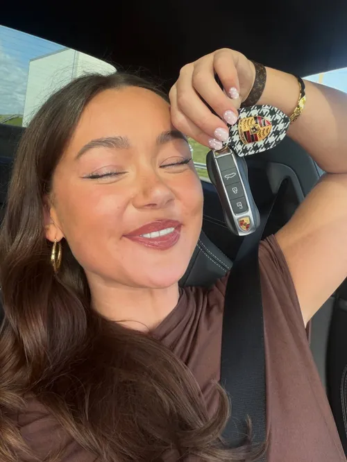 Op de beelden is te zien hoe ze trots naast de auto staat en het moment duidelijk vastlegt. Het is niet zomaar een aankoop, maar een mijlpaal waar ze lang naartoe heeft gewerkt.
