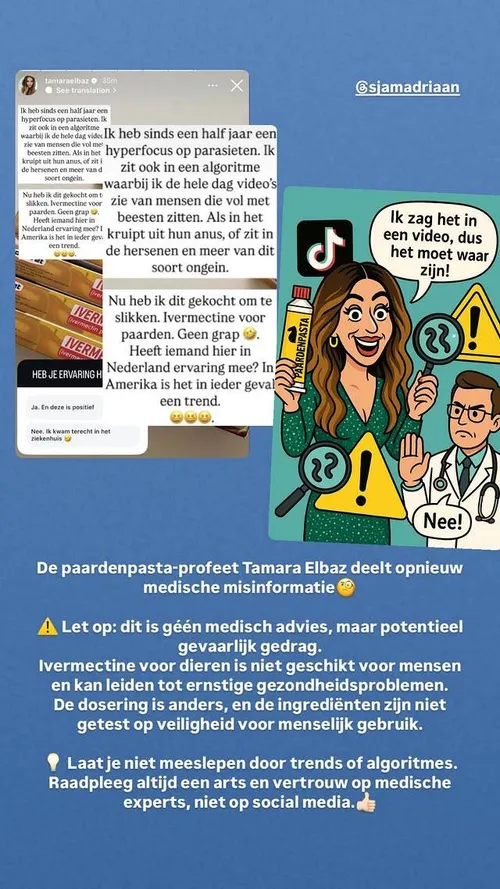 Paardenpastaprofeet Tamara Elbaz slaat weer toe: waar is Sjamadriaan als je 'm nodig hebt? Tamara Elbaz, ooit begonnen als influencer, nu beter bekend als zelfbenoemd parasietenexpert, heeft weer een flinke klapper gemaakt op social media. En niet op een goede manier. Deze keer prijst ze openlijk een paardenmiddel aan tegen parasieten. Letterlijk. Een tube met de tekst "Ivermectin paste - not for human use" prijkt trots in haar Instagram Story. Geen grap, zegt ze zelf. Nou, Tamara, we lachen ook niet.