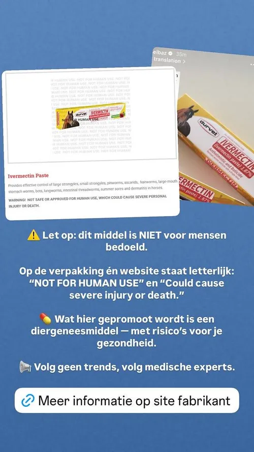 Het probleem is duidelijk. Ivermectine voor dieren heeft een andere samenstelling en dosering dan medicijnen voor mensen. Het is niet getest op veiligheid voor menselijke consumptie en kan ernstige bijwerkingen veroorzaken. Denk aan ziekenhuisopname leverproblemen of erger. Dus nee Tamara dit is niet gewoon een trend uit Amerika. Dit is levensgevaarlijk gedrag dat navolging kan krijgen door goedgelovige volgers