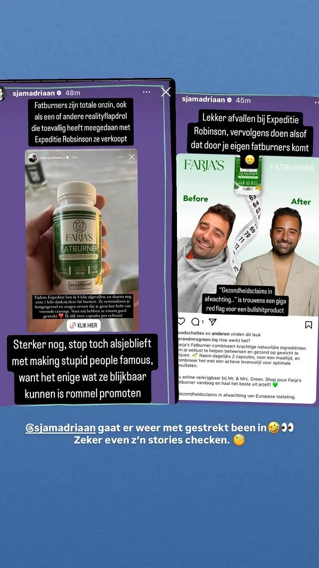 Het Instagramkanaal Sjamadriaan, ookwel Adriaan ter Braack, is iemand die influencers kritisch in de gaten houdt. En hij heeft wederom een opvallend voorbeeld van misleiding naar boven gebracht. Dit keer ligt Farja Farvardin, bekend als Fawrynotsawry op Instagram en een deelnemer van Expeditie Robinson 2024, onder vuur. De influencer gebruikte zijn sterk vermagerde uiterlijk na het bekende survivalprogramma om zogenaamd de effectiviteit van zijn eigen ‘fatburner’-pillen te promoten! Volgens Sjamadriaan is dit een enorm ernstige zaak.