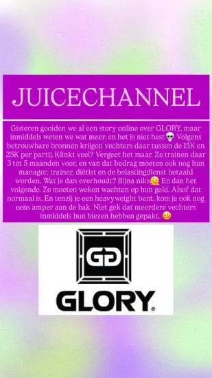 De vechtsportwereld gonst: volgens Juicechannel rommelt het heftig achter de schermen bij GLORY. In meerdere stories schrijft het roddelaccount dat er “van alles aan de hand” is en dat bronnen zelfs fluisteren dat de organisatie zou kunnen stoppen. Het is (nog) geen officieel nieuws, maar wél precies de soort vonk waar heel kickboksland van opschrikt.