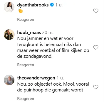Onder de aankondiging van het seizoenseinde van De Oranjezondag verschenen al snel reacties van kijkers. Niet iedereen lijkt blij met de pauze. “Nou jammer, en wat er voor terugkomt is helemaal niks dan maar weer voetbal of film kijken op de zondagavond,” merkt iemand op. Anderen zijn juist opgelucht dat het programma even van de buis is. Eén reactie leest: “Zo objectief ook. Mooi, vooral de puinhoop die gemaakt wordt.” Toch klinkt er ook waardering, zoals van presentatrice Dyanthe Brooks, die simpelweg reageert met een applaus-emoji. Kortom, het programma weet de gemoederen duidelijk nog steeds bezig te houden.