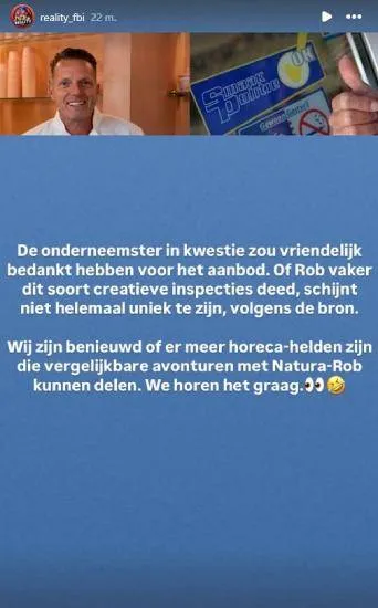 Binnen de horeca wordt er inmiddels met een knipoog gesproken over de zogenaamde ‘naturasticker’ een ludieke benaming voor gevallen waarin inspecties wel héél informeel verlopen. Of het hier om een eenmalige actie ging of dat Rob vaker zijn stickers op creatieve wijze uitdeelde, blijft vooralsnog in het midden. Maar het verhaal leeft. Uiteindelijk zou de Rotterdamse eigenaresse 'nee' gezegd hebben tegen het aanbod van Rob. Volgende keer beter, Rob!