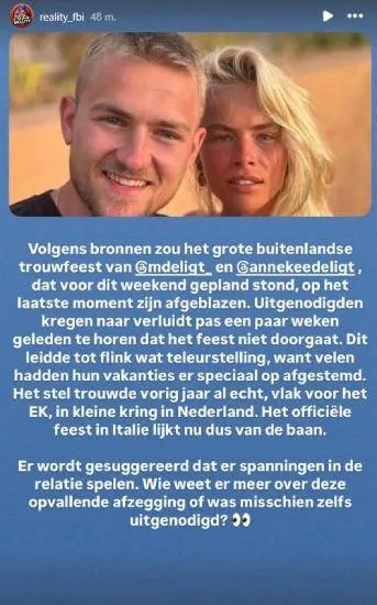 Het leek hét droomkoppel van de voetbalwereld: topverdediger Matthijs de Ligt en model AnneKee Molenaar. Na een intieme bruiloft in Nederland vorig jaar, stond er dit weekend een groots buitenlands feest gepland om hun huwelijk op spectaculaire wijze te vieren. Maar die plannen lijken plotseling volledig in duigen te zijn gevallen. Uit betrouwbare bronnen blijkt dat het feest last minute is afgeblazen. En dat zorgt voor opgetrokken wenkbrauwen én gefluister over mogelijke relatieproblemen. Wat is er écht aan de hand? Uitgenodigden laten met lege handen achter
