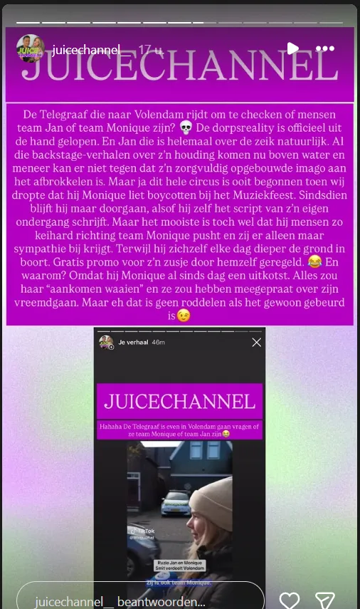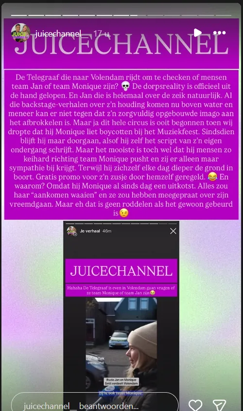 Opmerkelijk is dat dezelfde stories constateren dat Jan met zijn opstelling juist “gratis promo” voor Monique creëert. Waar hij, volgens de tekst, zijn reputatie “elke dag dieper de grond in boort”, groeit tegelijk de sympathie voor zijn zus. Dat frame Jan die verliest, Monique die wint sijpelt steeds vaker door in de commentaren en DM’s die in de screenshots voorbij komen.