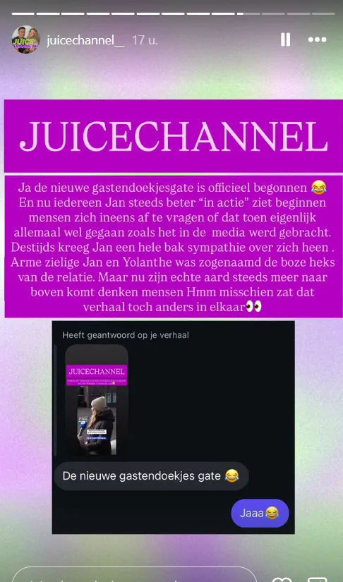 Een tweede story gaat nog een stap verder en spreekt van een “nieuwe gastendoekjesgate”. De strekking: hoe meer mensen Jan nu “in actie” zien, hoe vaker ze zich afvragen of oude verhalen wel klopten zoals ze destijds in de media zijn gebracht. In diezelfde tekst wordt opgemerkt dat Jan toen “een bak sympathie” kreeg en dat Yolanthe door sommigen als “boze heks” werd neergezet. Nu, stellen de stories, “komt zijn echte aard meer naar boven” en denken mensen: misschien zat dat verhaal toch anders in elkaar. Een gedeelde DM vat het samen met een knipoog: “De nieuwe gastendoekjes gate.”