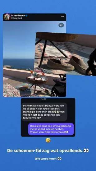 Het begon allemaal onschuldig: Iris deelde op haar Instagram een zonnige vakantiefoto uit Griekenland. Uitzicht op zee, een Aperol Spritz op tafel… en een paar opvallend mannelijke schoenen naast het tafeltje. "Mijn vriend heeft deze schoenen ook!" fluistert een oplettende volger via DM. Het gerucht dat Iris misschien niet alleen op reis was, begon direct te zoemen in de digitale wandelgangen.