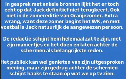 Oranjezomer. Jack staat bekend om zijn directe stijl en ongefilterde meningen. Die houding leverde hem zowel fans als critici op. Zijn definitieve vertrek bij De Oranjewinter markeert mogelijk het einde van zijn rol als vaste talkshowgast, maar zijn naam blijft voorlopig nog wel onderwerp van gesprek.
