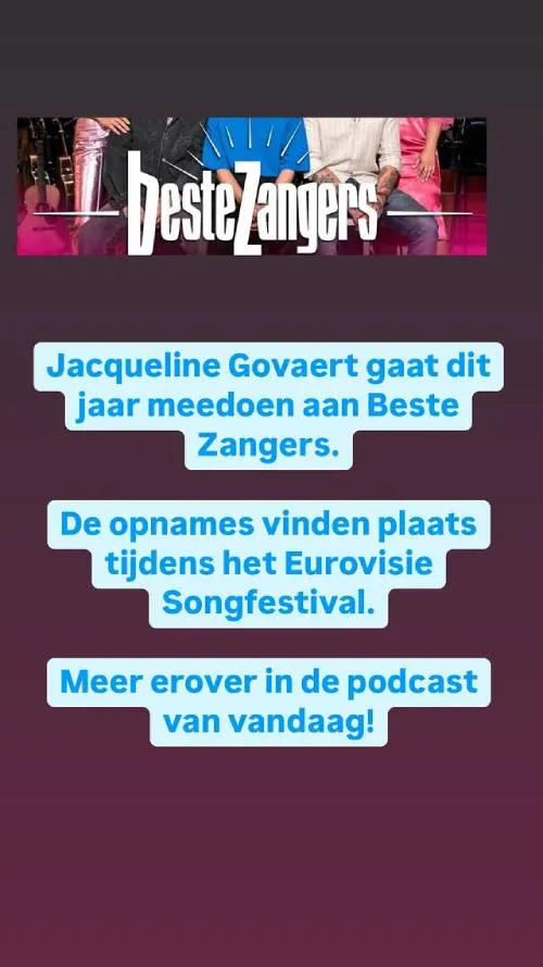 Jacqueline Govaert is stilletjes afgeserveerd door het Songfestival. Toch weet ze het verlies aardig te verwerken. Het leek er even op dat Jacqueline Govaert stilletjes aan de kant was geschoven als co-commentator van het Eurovisie Songfestival, maar dat blijkt helemaal niet het geval te zijn. De zangeres van Krezip heeft zelf ervoor gekozen om niet terug te keren om commentaar op de liedjes te geven. Ze heeft die keuze gemaakt, zodat ze zich kan focussen op iets anders leuks. In plaats van commentaar geven op de Songfestival optredens, gaat ze zelf weer volop in de spotlights staan bij Beste Zangers.