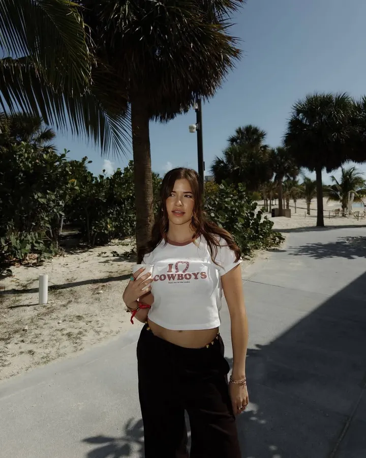 Op de bijbehorende foto zien we Jade op een zonnige boulevard, omringd door palmbomen en gekleed in een ‘I love Cowboys’ crop top. Strakke buik, nonchalant pose en een drankje in de hand. Het is bijna alsof ze uit een videoclip is gestapt. Maar vergis je niet: achter die flirty look zit een meisje dat heel goed weet wat en wie ze wil. Haar liefde voor cowboys mag dan op het shirt staan, haar hart ligt overduidelijk bij één specifieke jongen. Kenneth dus. De enige cowboy die echt telt.