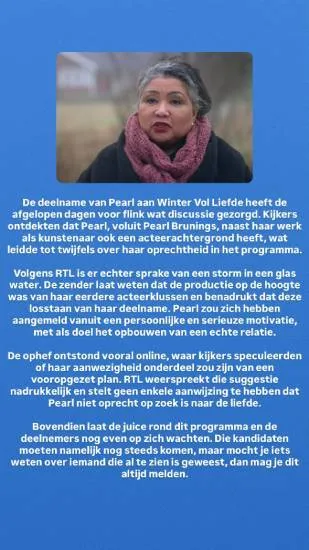 In dezelfde reactie wordt ook iets gezegd over de motivatie van Pearl om mee te doen. RTL stelt namelijk dat Pearl zich zou hebben aangemeld vanuit een persoonlijke en serieuze motivatie, met als doel het opbouwen van een echte relatie. Dat is precies waar het programma om draait en volgens de zender is er geen enkele aanwijzing dat Pearl daar niet oprecht in zou zijn.