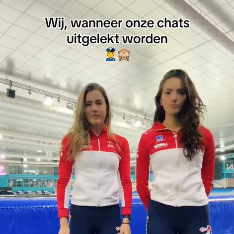 Robin Groot doet er goed aan om de twee ook op TikTok te volgen. Daar gaan ze vaak nóg verder dan op Instagram! We zien de twee schaatssters op het ijs, keurig in tenue, met hun handen alsof ze gearresteerd willen worden. De caption erboven? “Wij, wanneer onze chats uitgelekt worden.” En dat zegt eigenlijk alles.