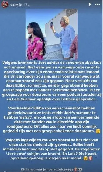 Jort kelder is alles behalve blij over het gerucht dat hij een relatie zou hebben met een 37 jaar jongere vrouw genaamd Edibe. De ophef draait niet per se om het leeftijdsverschil, maar vooral om wat zich daarvóór zou hebben afgespeeld. Edibe, die inmiddels onderwerp van gesprek is op sociale media, zou eerder haar pijlen hebben gericht op niemand minder dan Sander Schimmelpenninck.