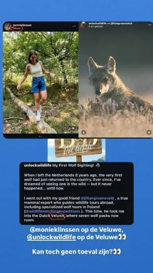 Dick, die zichzelf op Instagram @unlockwildlife noemt, was helemaal door het dolle heen toen hij zijn eerste wolf in de Veluwe spotte. “My First Wolf Sighting!”, schreef hij trots bij zijn post. Toeval wil dat… Moniek diezelfde dag óók vrolijke kiekjes uit de Veluwe deelde.