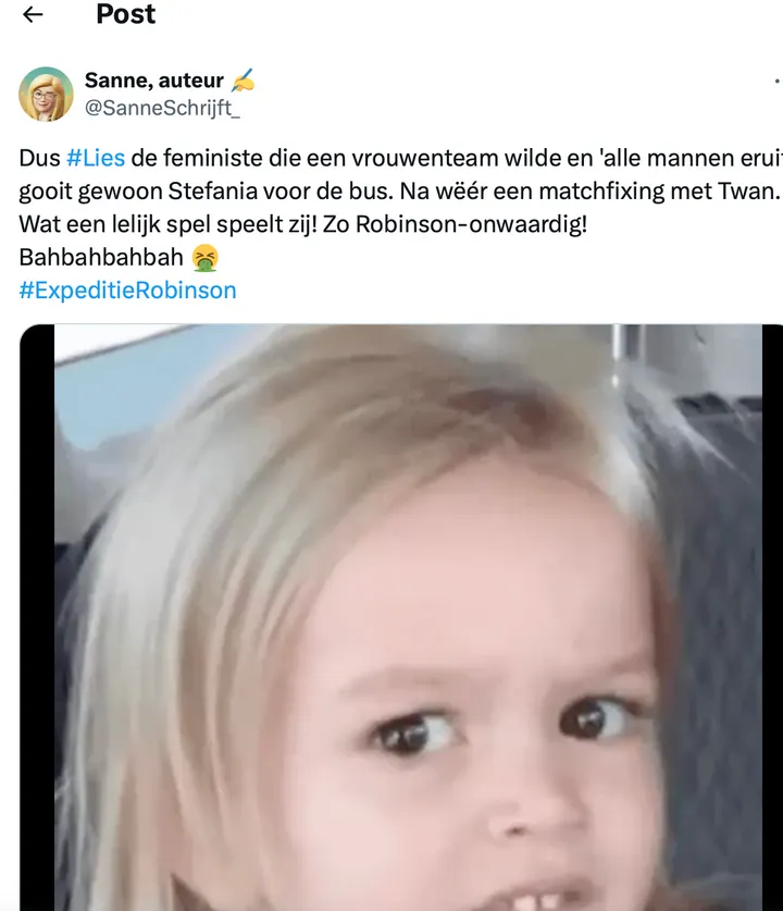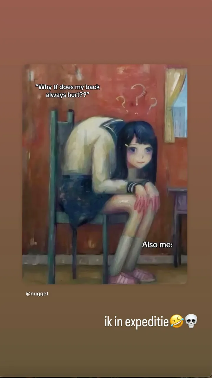 Wie de beelden van dit seizoen bekijkt, kan het niet missen: Lies’ schouders staan vaak naar voren, alsof ze continu tegen de wind in leunt. Dat ziet ze nu zelf ook. Haar oplossing? Niet defensief doen, maar het voor te zijn met humor. Met die schilderij-post (ja, het meisje op het doek zit er nóg krommer bij dan Lies zelf) zet ze het onderwerp open en laat ze zien dat ze erom kan lachen—ook als het over haar eigen lichaamstaal gaat.