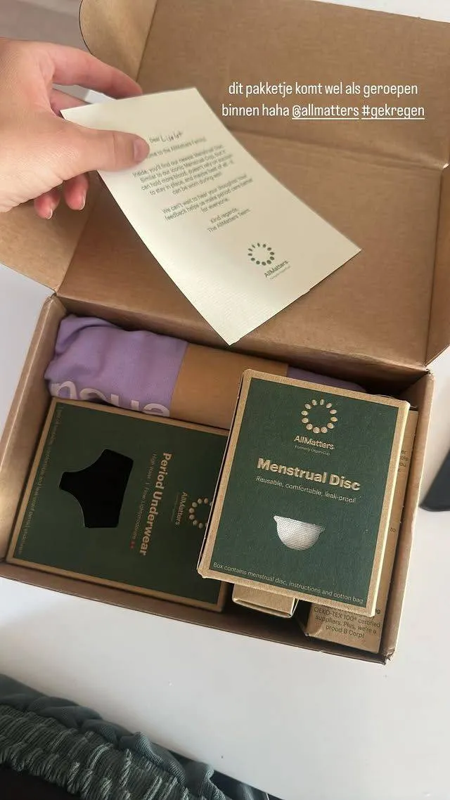 Op de eerste foto is Lies te zien in bed, met een verfrommeld gezicht en een dekentje half over haar hoofd. “Niet m’n beste nacht ooit,” schrijft ze erbij, gevolgd door een rood hartje en het veelzeggende icoontje van een druppel. Maar dan gebeurt het. Verlossing. De volgende foto toont een kleurrijke doos vol menstruatieproducten, van tampons tot maandverband en zelfs een reep chocola. Lies houdt hem trots omhoog alsof ze net een prijs heeft gewonnen.