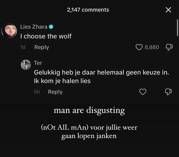 Lies Zhara krijgt enorm veel vieze berichten van mannen. Dat komt door één origineel bericht. Onder een Tik Tok heeft ze een reactie geplaatst. Daar laat ze weten dat ze liever een wolf kiest dan een man. Maar daar krijgt ze een onverwachte reactie op waar ze erg van schrikt. Er stond namelijk: