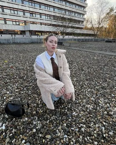 OGENE lid Lisa Vol gaat flink door haar knieën. Dit doet ze op het dak van een gebouw. Het is te zien dat daarbij ook nog eens kusjes achter laat. Dit lijkt niets nieuws voor haar want haar broek is bij de knieën gescheurd.