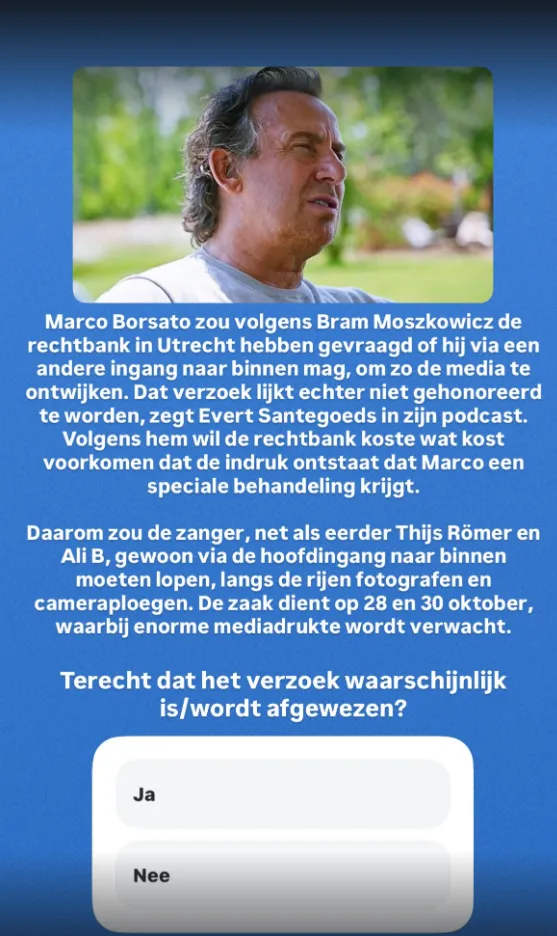 Marco Borsato zijn aanstaande rechtbankbezoek van tevoren een beetje te dirigeren. Dat meldde de roddelkoning in zijn podcast, naar aanleiding van informatie die hij via Bram Moszkowicz verkreeg. De gevallen zanger probeerde toestemming te krijgen om via de achteringang de rechtbank in te glippen. Zo zou hij de horde camera’s en fotografen ontwijken. Begrijpelijk misschien, maar de rechtbank ziet daar niks in. Iedereen is gelijk voor de wet, dus ook Marco moet gewoon via de voordeur verschijnen.