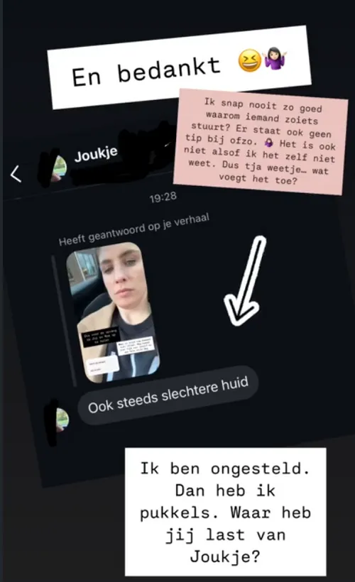 In haar reactie maakt Marieke meteen korte metten met de opmerking van niks. Ze zegt: “Ik ben ongesteld. Dan heb ik pukkels. Waar heb jij last van, Joukje?” En eerlijk: je moet het maar durven om zo ongefilterd en eerlijk te reageren. Ze zet er zelfs een pijltje bij, wijzend naar het lullige DM’tje, en schrijft erbij: “En bedankt.” Tja, als je niet aardig kunt zijn, moet je misschien gewoon even je mond houden, toch?