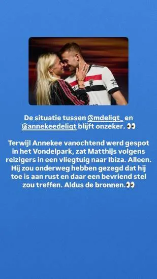 De relatie tussen voetballer Matthijs de Ligt en zijn knappe vriendin AnneKee Molenaar lijkt al een tijdje op losse schroeven te staan. Waar de twee ooit onafscheidelijk leken, is de afstand tussen hen momenteel allesbehalve figuurlijk. Terwijl AnneKee vanochtend nog vrolijk gespot werd in het Amsterdamse Vondelpark, koos Matthijs opnieuw het luchtruim, en niet richting huiselijke rust... Matthijs de Ligt zit liever alleen op Ibiza