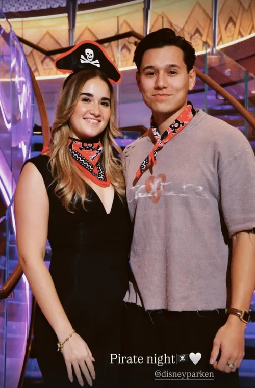 Een detail dat meteen opviel: Melanie en haar vriend droegen allebei een soort bandana achtig lint om hun nek. Het was een subtiele maar leuke match, precies het soort stylingtruc dat koppels gebruiken wanneer ze zich laten meevoeren door de sfeer van een plek. Niet overdreven, niet geforceerd, maar gewoon precies goed. Het gaf hun outfits een extra playful touch en zorgde ervoor dat ze tegelijk losjes en stijlvol voor de dag kwamen. Die matching look maakte de foto’s nog leuker en gaf hun Disney trip net dat beetje extra charme.