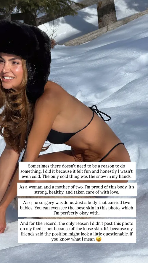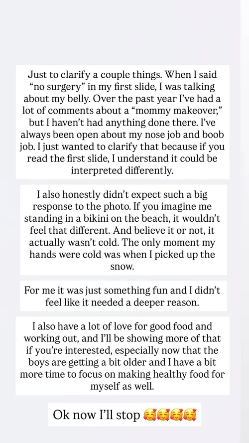 Ze benadrukte daarnaast trots te zijn op haar lichaam als moeder van twee kinderen. “Als vrouw en moeder van twee ben ik trots op dit lichaam. Het is sterk, gezond en met liefde verzorgd.” Ook schreef ze: “Er is ook geen operatie gedaan. Gewoon een lichaam dat twee baby’s heeft gedragen. Je kunt op deze foto zelfs de losse huid zien, en dat vind ik helemaal prima.” Die zin zorgde voor veel ophef.