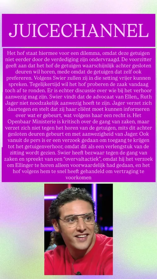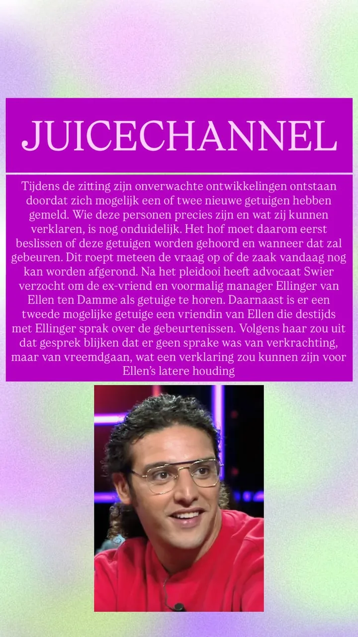 Tijdens de zitting zijn er onverwachte ontwikkelingen ontstaan doordat zich mogelijk nieuwe getuigen hebben gemeld. Wie deze personen precies zijn en wat zij kunnen verklaren, is nog niet duidelijk. Dat maakt de situatie meteen ingewikkeld. Volgens de informatie zou advocaat Swier hebben gevraagd om onder andere de ex-vriend en voormalig manager van Ellen, Ellinger, te horen als getuige. Daarnaast zou er ook een vriendin van Ellen zijn die destijds gesprekken heeft gevoerd over wat er zou zijn gebeurd.