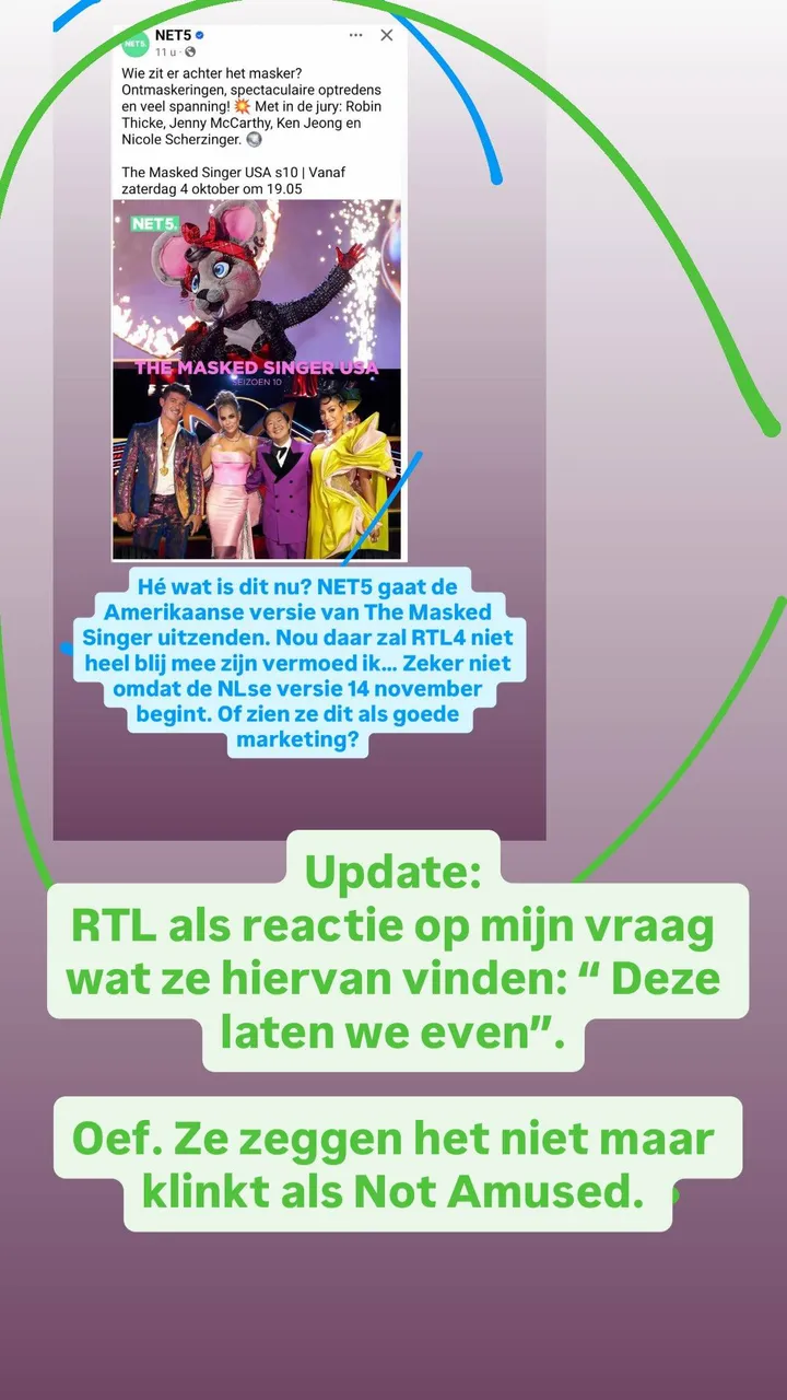 RTL 4. Daarmee pakt Net5 ruim een maand voorsprong. Voor kijkers betekent dat extra veel Masked Singer, maar voor RTL is het vooral lastig. Waar ze normaal gesproken alle aandacht en spanning naar zich toe trekken, kan de Amerikaanse versie nu alvast een deel van de nieuwsgierigheid opslokken.