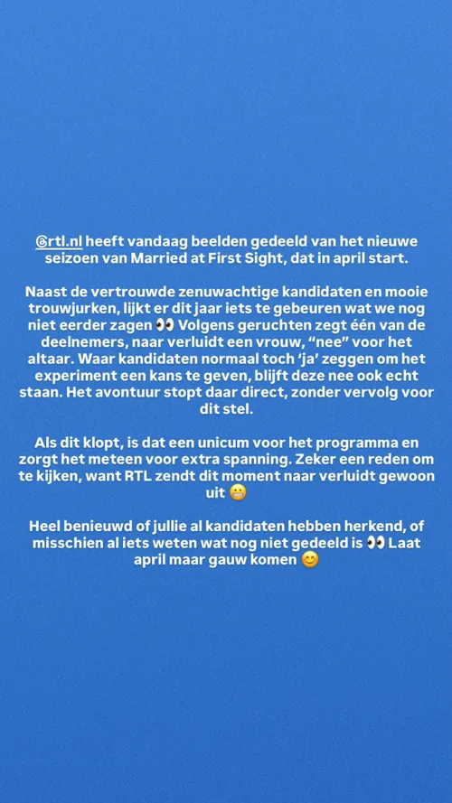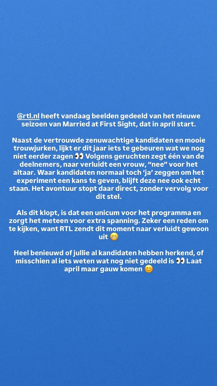 Met deze opvallende ontwikkeling heeft Married at First Sight nog vóór de eerste aflevering al voor spanning gezorgd. Het belooft een seizoen te worden waarin alles anders kan lopen dan we gewend zijn. Of het gerucht klopt en hoe het moment precies verloopt, zal in april duidelijk worden. Maar één ding is zeker: dit seizoen begint nu al met een knal.