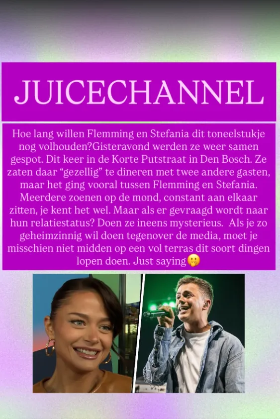 Flemming en Stefania stiekem een setje? Ze ontkenden het keer op keer, maar nu lijkt er geen ontkomen meer aan. Onlangs werden ze openlijk zoenend gespot op een druk terras in Den Bosch. Juicekanalen en roddelsites die er al maanden op hameren, hebben eindelijk het bewijs waar ze op wachtten. Het lijkt erop dat het stel hun liefde vanaf nu gewoon durft te tonen en hoe!