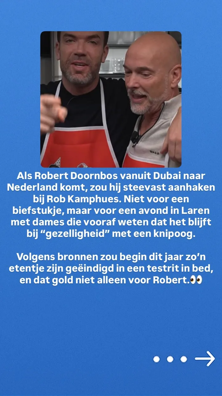 Een van die avonden, begin dit jaar, zou geëindigd zijn in een 'testrit' in bed. En dat gold niet alleen voor Robert, ook Rob Kamphues zou van de partij zijn geweest. Zijn naam duikt al langer op in berichten over appjes en foto’s naar veel jongere vrouwen. Zijn partner schijnt daarom scherp op hem toe te zien, zeker na eerdere misstappen.