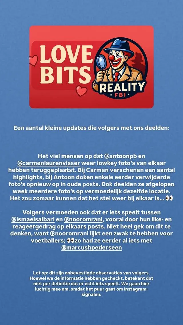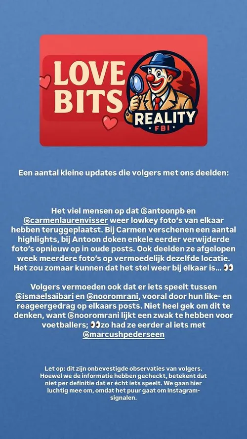 Wat je ook van haar vindt, Noor weet hoe ze in the picture blijft. Zonder iets te bevestigen of te ontkennen laat ze haar socials het werk doen. Een like hier, een story daar, en plots sta je op RealityFBI met een vermeende nieuwe vlam. Noor speelt het slim, houdt het mysterieus en vooral: vermakelijk. Het is een beetje zoals Noa Vahle met haar verfroller. Je weet niet helemaal wat er gebeurt, maar je wil blijven kijken. Dus of het nu echt aan is of gewoon Instagram-flirt, één ding is zeker. Noor Omrani maakt van simpele likes groot nieuws. En wij? Wij zitten op de eerste rij.