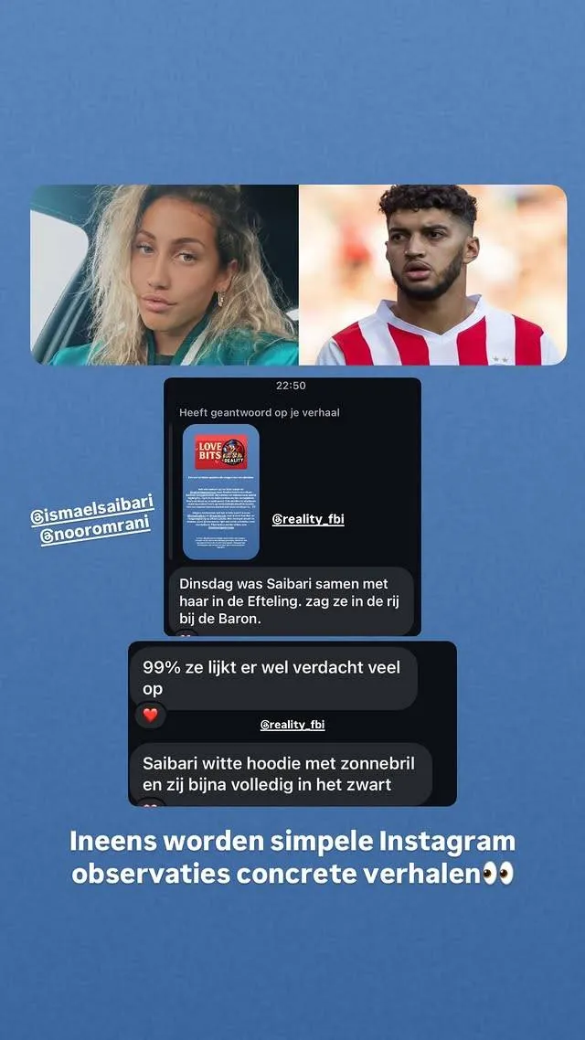 “Dinsdag was Saibari samen met haar in de Efteling,” stuurde een volger naar RealityFBI. “Zag ze in de rij bij de Baron.” En alsof dat nog niet juicy genoeg was, kwamen er nog wat extra details bij. Hij in een witte hoodie met zonnebril, zij bijna volledig in het zwart. Geen voetbaltenue dus, maar wél verdacht veel couple-vibes. 99% zeker, aldus de spotter. En eerlijk is eerlijk, dat klinkt als meer dan zomaar een gezellig dagje uit.