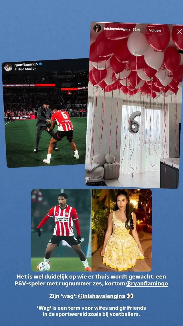 De oplettende volger wist het al langer: Inisha Valengina is de vriendin van Ryan Flamingo, en wat voor één. Op Instagram trakteert ze haar volgers regelmatig op jaloersmakende kiekjes. Denk aan stijlvolle jurken, vakantiefoto’s waar je spontaan je koffers van pakt en elegante selfies met een zachte glamourfilter. Een blik op haar profiel en je snapt meteen waarom Ryan met zo’n brede glimlach het veld op stapt. Inisha laat zien dat ze meer is dan ‘alleen maar’ een voetbalvrouw. Ze heeft stijl, flair en duidelijk een gevoel voor romantiek. Dat blijkt niet alleen uit haar outfits, maar ook uit haar acties. Ze weet precies hoe ze haar vriend moet verrassen, niet met glitter of opsmuk, maar met oprechte aandacht en liefde. En dat maakt haar misschien wel de leukste ‘WAG’ van dit PSV-seizoen.