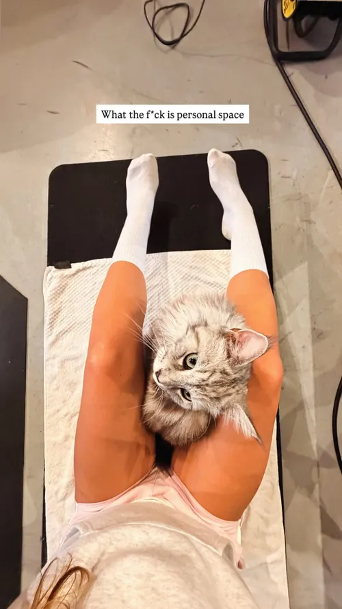 wielrenster een foto van bovenaf, genomen vanaf haar eigen borstkas richting haar knieën. Op de grond ligt een trainingsmat met een witte handdoek, Puck draagt witte sportsokken en een lichtroze short. Tussen haar bovenbenen, pal op de handdoek, heeft zich een grote zilvergrijze kat comfortabel geïnstalleerd. De tekst in beeld luidt droog: “What the f*ck is personal space.” Beter kun je het niet samenvatten.