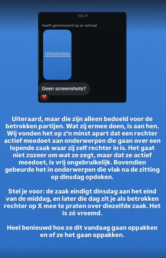 De meeste mensen volgen de rechtszaak via Saskia Belleman, de bekende rechtbankverslaggever van De Telegraaf, die bijna alles live deelt via X. Zij is inmiddels hét gezicht geworden van rechtszaken in Nederland. Maar in dit geval gebeurde iets vreemds: de rechter die de zaak van Marco leidt, begon vragen te beantwoorden die eigenlijk aan Saskia Belleman gericht waren. Alsof ze even wilde meedoen in het gesprek. En dat roept natuurlijk vragen op. Waarom zou een rechter zich mengen in discussies over een eigen zaak?
