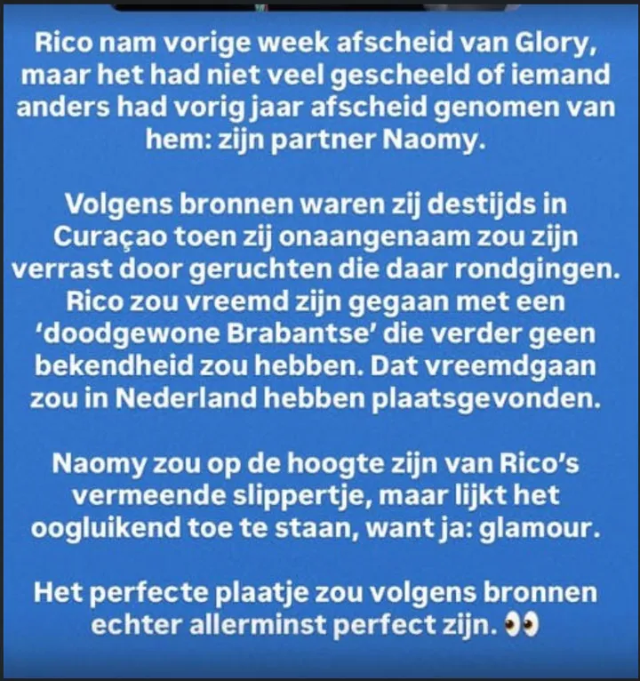 Tijdens hun vakantie op Curaçao kwam er pas echt vaart in het verhaal. Terwijl hun feed vooral bestond uit zon, sportsessies en vrolijke vakantiekiekjes, doken online claims op dat Rico daar mogelijk vreemd zou zijn gegaan. Het blijft volledig onbevestigd en is nooit met enig bewijs onderbouwd, maar zoals altijd op internet: zodra één iemand het roept, herhalen honderd anderen het. De echte feiten? Die ontbreken volledig.